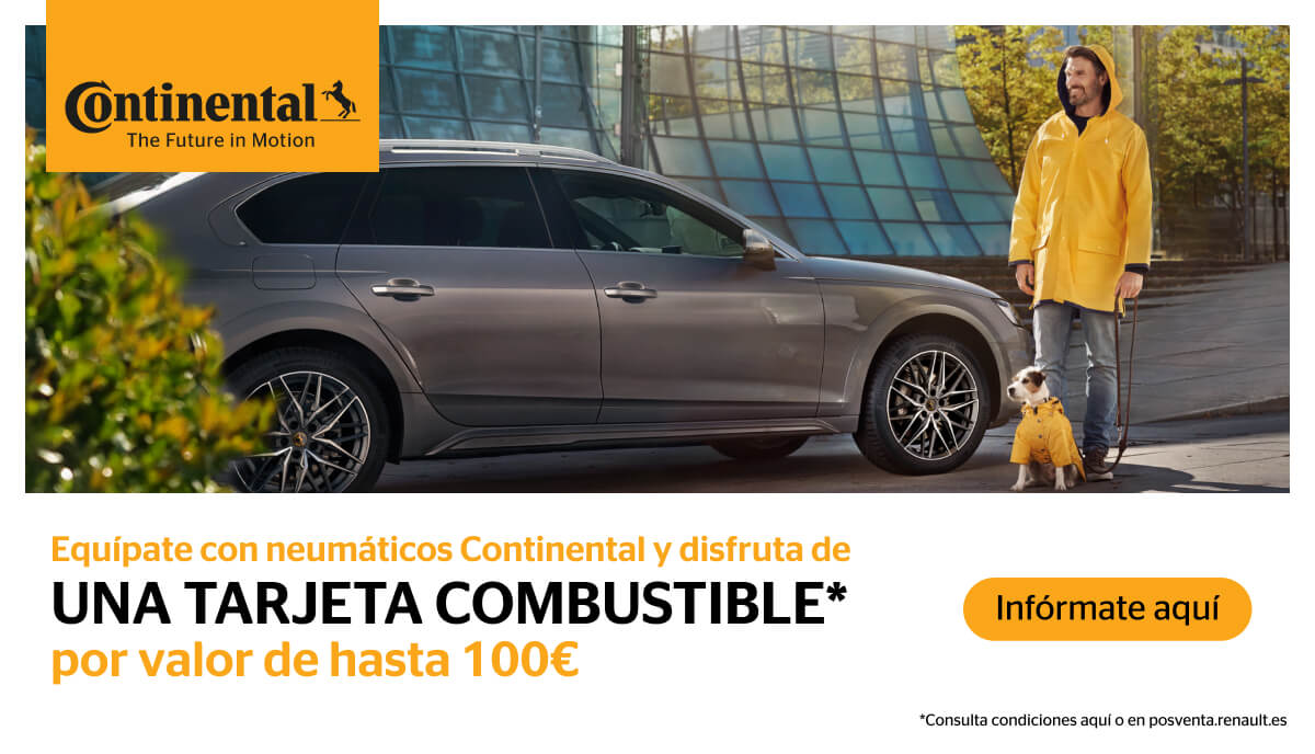 Este otoño acuérdate de revisar los neumáticos de tu coche. Del 10 de noviembre al 15 de diciembre, equipa tu Renault con neumáticos Continental y podrás conseguir una tarjeta regalo por valor de hasta 100€*. Recuerda que unos neumáticos en buen estado y con una presión adecuada, te ayudarán a optimizar el consumo de combustible y reducir su desgaste.